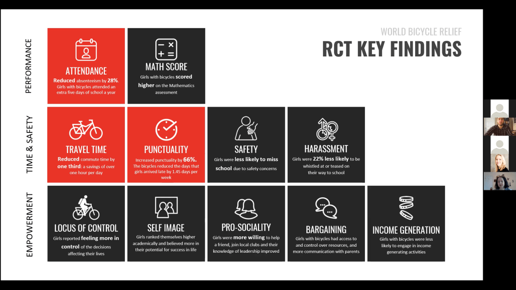 Susan Bornstein (Global Director, Institutional Partnerships & Influence) from World Bicycle Relief (WBR) presented the research findings from Wheels of Change: The Impact of Bicycles of Girls’ Education and Empowerment Outcomes in Rural Zambia.  Susan shared WBR’s Bicycles for Educational Empowerment Program (BEEP), which provides bicycles to students, teachers, and school volunteers to improve access to education. The World Bicycle Relief research team conducted a randomized control trial, and key findings included reduced absenteeism, reduced travel time, and increased punctuality for students who received bicycles. Currently, WBR is undertaking the 2022 BEEP Zambia follow-up research to assess long-term outcomes. WBR and USAID are partnering for an upcoming project called “Bicycles for Growth to improve bicycle availability and uptake for mobility in sub-Saharan Africa.