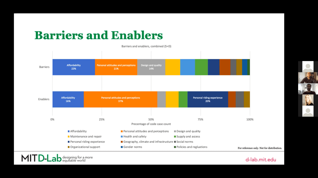 Next, Jonars Spielberg from the Massachusetts Institute of Technology D-Lab presented findings from the project Improving Access to Affordable Bicycles in Africa. Jonars discussed the factors influencing access to cycling, including the purpose of the bicycle (e.g. load carrying), the COVID-19 pandemic, cycling conditions, ownership, procurement, and maintenance of the bicycle. Barriers and enablers were also discussed, including affordability, personal attitudes and perceptions, design and quality, and personal riding experience. For more information, feel free to contact the team via email.