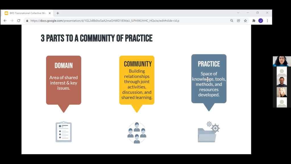 After presentations, Jess Nachman from York University facilitated a workshop on the benefits of Communities of Practice and how to create a collaborative space for the BFD space. We then went into breakout rooms to discuss how we might benefit from a Community of Practice, or simply a collective space to connect.