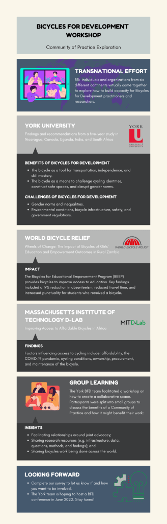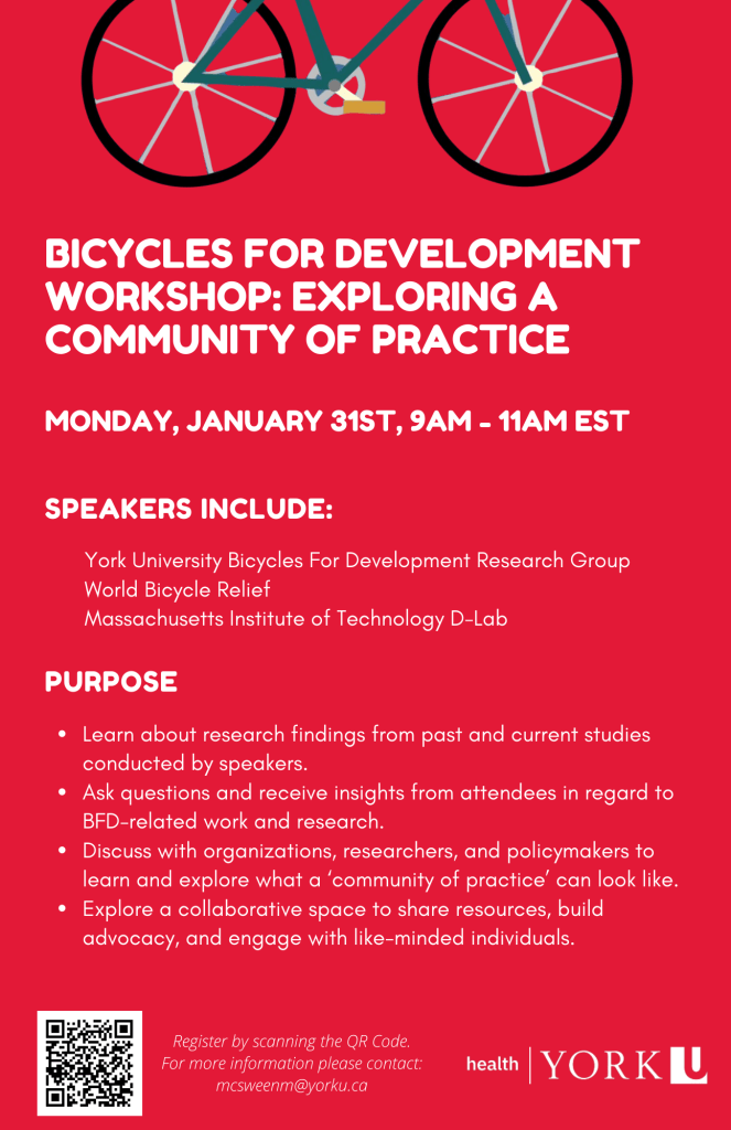 This workshop will review past and current work taking place in the BFD sector by York University’s BFD research team , World Bicycle Relief , and Massachusetts Institute of Technology (MIT) D-Lab’s research team, to identify ways forward for research, practice, and policy on the role of the bicycle in development. The workshop will also provide an overview of a ‘Community of Practice’ and offer an opportunity for discussion between organizations, researchers, and policymakers to begin to construct a ‘community of practice’ intended to form a Transnational Bicycle Collective made up of stakeholders within the BFD field. Overall, the workshop is intended to create a collaborative space for BFD stakeholders to work with one another moving forward. The workshop will be held online to accommodate stakeholders from different countries and regions.